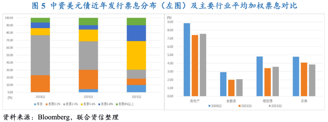 从发行票息分布来看,2021年二季度,发行票息在0~2%、2~4%、4~6%、6~8%、8%以上的发行规模占比分别为8.5%、12.2%、38.3%、21.5%和9.7%,其中零息债券占比9.9%。具体来看,本季度中资美元债发行成本以中高票息为主,发行票息大于4%(含)的债券规模占比高达69.5%,环比和同比分别增加38.0和46.3个百分点;本季度,发行期限向中长期聚集,短期限区间大幅收窄。一方面,发行票息在4~6%之间为中资美元债的高发区间,占总发行规模的38.3%,环比和同比分别增长22.5个和28.7个百分点;发行票息在6~8%之间的高票息区间呈现走扩趋势,占总发行规模的21.5%,环比和同比分别增长15.8个和14.1个百分点;发行票息在8%以上的高票息占总发行规模的9.7%,环比下降0.2个百分点,同比增长3.5个百分点。另一方面,发行票息在2~4%之间的低票息区间呈现大幅收窄趋势,占总发行规模的12.2%,环比和同比分别大幅下降26.0个和41.7个百分点;发行票息在0~2%之间的低票息区间也显著回落,占总发行规模的8.5%,环比和同比分别大幅下降17.5个和14.1个百分点;低票息债券中唯独零息债券规模占比有所增长。
