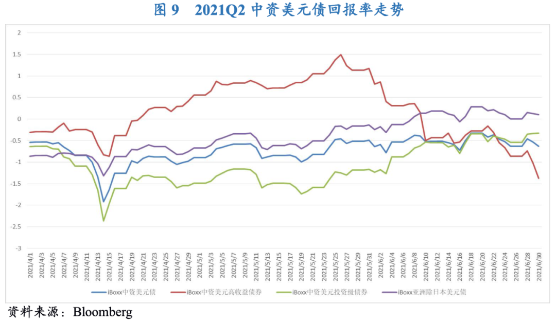 2021年二季度信用风险事件继续发酵,拖累中资美元债收益表现。二季度,Markit iBoxx中资美元债指数总回报率继续保持在负值区间,为-0.1%,环比收窄0.6个百分点,主要是因为5-6月投资级中资美元债再美国市场流动性宽裕环境下呈现反弹,投资者风险情绪得到小幅缓解。其中,恒大以及蓝光等负面消息再次打击市场情绪,对高收益地产板块产生溢出效应,加之融资监管持续收紧,高收益中资美元债二季度回报率继续下跌至-1.1%,环比和同比分别降低了0.4个和10.4个百分点;投资级中资美元债本季度回报率由负转正,为0.3%,主要是因为非金融机构表现相对稳定,对投资级收益率起到提振作用。
