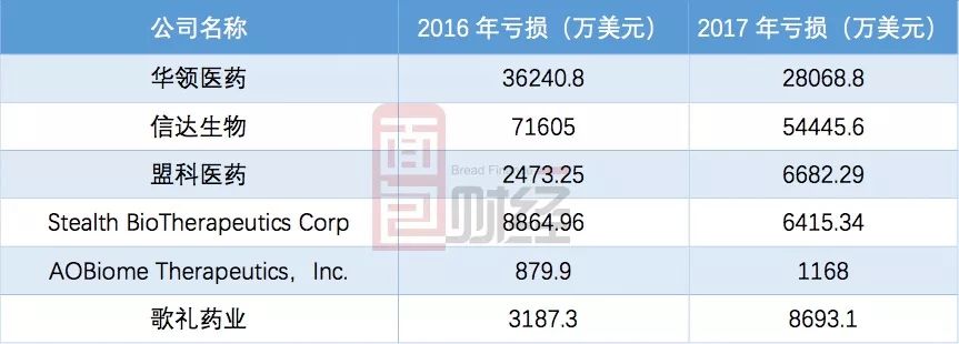 其中,信达生物是近两年亏损最多的公司,两年合计亏损12.61亿美元,亏损最少的公司是AOBiome,2016、2017年合计亏损2047.9万美元。但根据已公布的聆讯资料,信达生物目前的在研药品也是6家之中最多的共计17种。