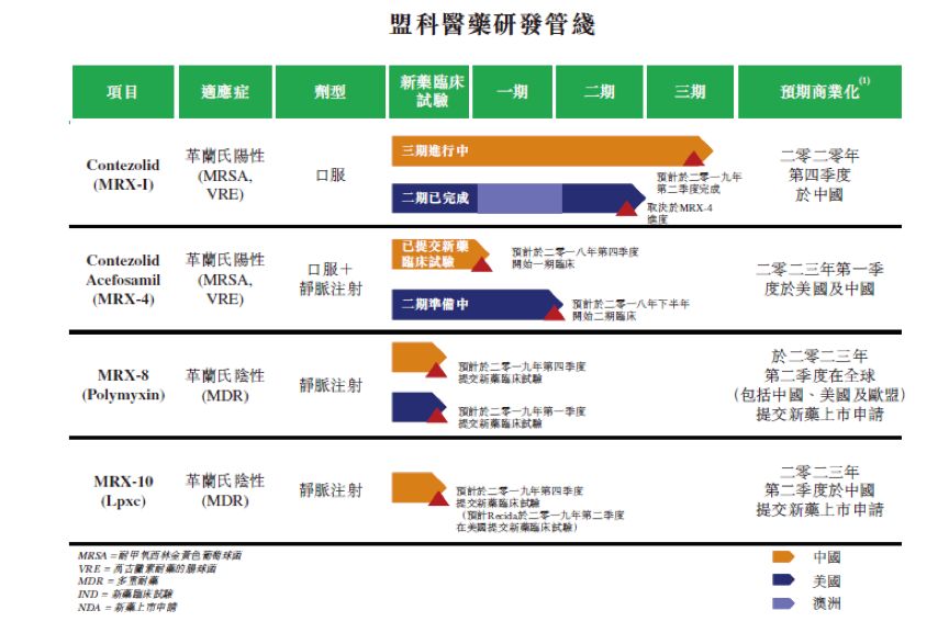 盟科医药是以研发多重耐药即超级细菌感染的抗菌药为主。公司的在研项目只有4个,其中主要产品有治疗革兰氏阳性多重耐药菌感染的contezolid(MRX-I)以及contezolid acefosail(MRX-4)。公司研发最快的项目MRX-I预计最快2020年年底在国内上市。