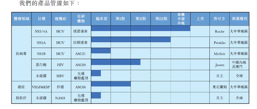 公司的核心产品包括戈诺卫(达诺瑞韦)、拉维达韦、ASC09以及ASC06。目前中国食品药品监管总局于2018年6月8日授出有关戈诺卫的新药申请批准,并在国内开始将戈诺卫进行商业化。以下是公司7个在研药品的研发进度。