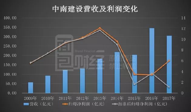 翻查财报:2017年,中南建设扣除非经常性损益后的归母净利润约1.1亿元,相比于上一年下滑69.96%。
