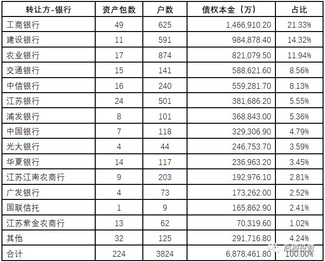 五大国有银行中,工行出让规模遥遥领先,其中中国银行全年仅转让了32.9亿债权,预计后期有较大的处置压力。股份制银行中,中信银行一马当先。