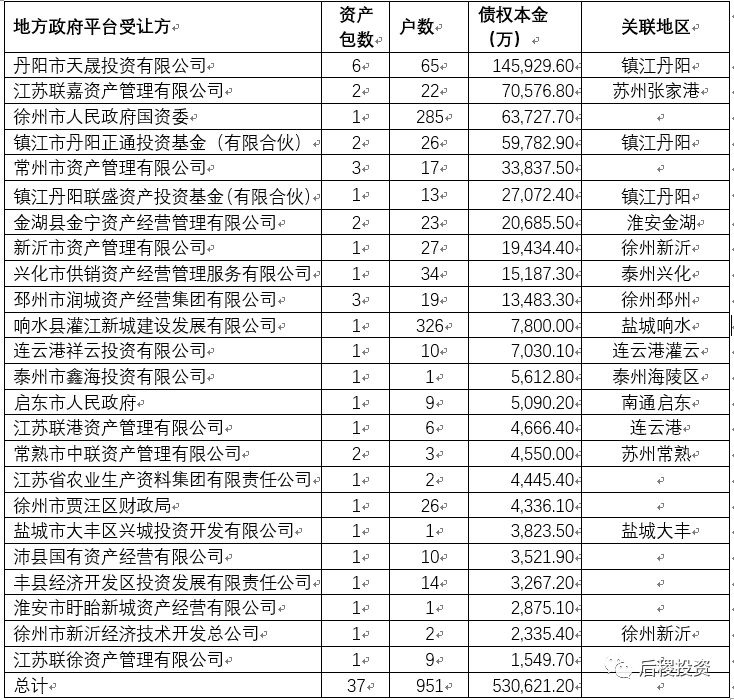 据不完全统计,江苏各地方政府平台直接收购的债权本金达53亿,其中约60%从持牌AMC受让,40%从银行受让。