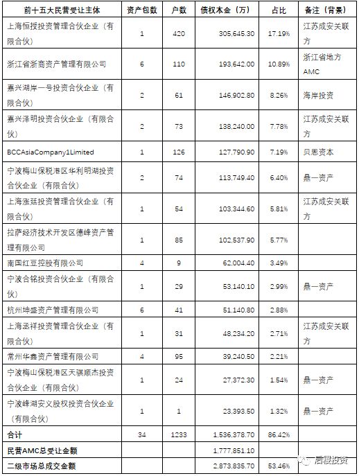 江苏二级市场,概括起来,其实就是个大机构投资市场,前十五大民营投资机构,合计受让153.6亿,占民营AMC受让比重达86%以上,与二级市场总成交的287亿相比,占比也达到了53.46%。