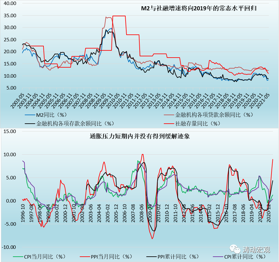 截至2021年5月,社融、M2、存款与贷款增速已分别降至11%、8.30%、8.90%和12.20%,较2020年同期均有明显下降。我们认为,考虑到M2与社融已接近潜在名义经济增速水平,预计下半年上面四个指标还会有约0.50个百分点左右的下降空间,回归至2019年的常态水平。