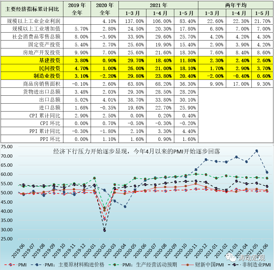 2、从三驾马车的表现来看,消费与投资等内需整体上仍处于低位缓慢修复态势,房地产投资与贸易端延续了2020年的表现,对上半年的经济修复贡献力度较大,如1-5月的房地产投资累计同比、货物进出口总额累计同比分别达到8.60%和28.20%。其中,房地产投资累计同比的两年平均值高达8.60%,1-5月民间投资与制造业投资累计同比的两年平均值则分别为3.70%和0.60%,较2019年的水平还有不少距离。同时PPI上行压力亦比较大,但CPI弱势仍比较明显。