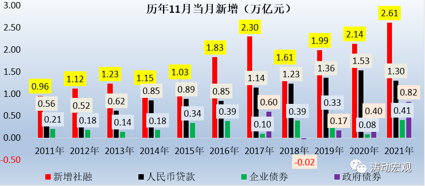债券同比明显多增的因素主要有两个,政府债券是因为地方政府在10-11月放量发行,企业债券则是由于去年11月受河南永煤事件影响导致同期基数较低。