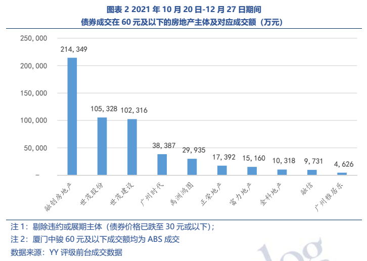公开信息显示融创2021年12月有14亿元ABS+1.5亿元供应链ABS到期,2022年一季度有35亿元公司债+10亿元ABS到期,此外访谈信息显示一季度到期债务还有77亿元贷款+20~30亿元信托+境外融资4亿元美金(有部分是质押万达股票)。境内活跃券“20融创02”成交净价自10月底来一路下跌,12月初在一行两会表态后有一波上涨,随后继续下跌,目前在49元左右。