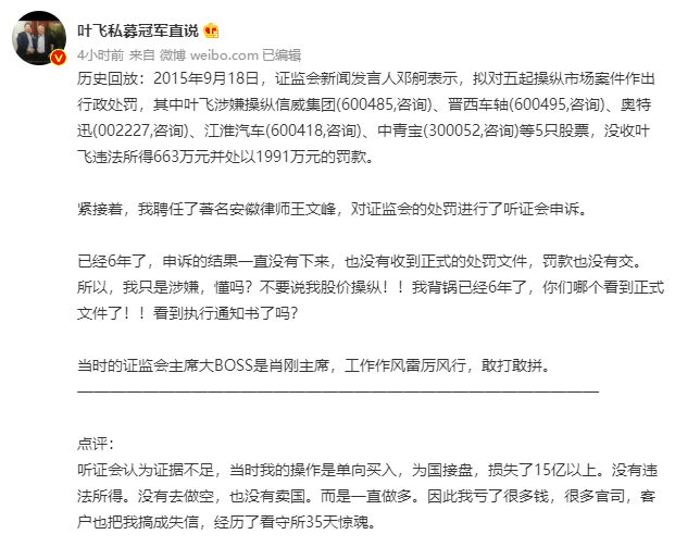 不过对此,叶飞于2021年5月14日在微博回应称,自己当时的操作是单向买入,为国接盘,损失了15亿以上,没有违法所得。因此亏了很多钱,摊上很多官司,客户也把自己搞成失信,但至今正式的处罚文件并未下达,罚款自己也没交。