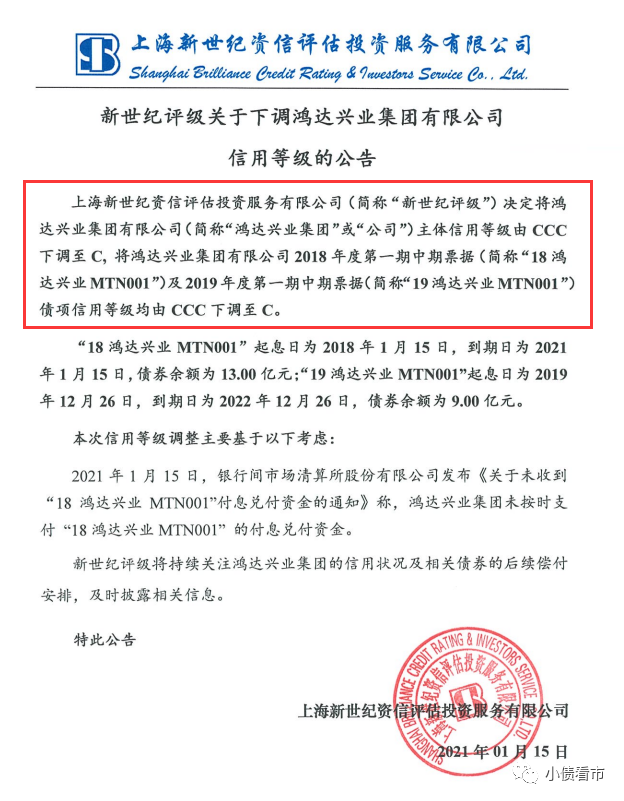 近日,新世纪评级将鸿达兴业集团有限公司(以下简称“鸿达兴业集团”)主体和“18鸿达兴业MTN001”、“19 鸿达兴业MTN001”债项信用等级由CCC下调至C。