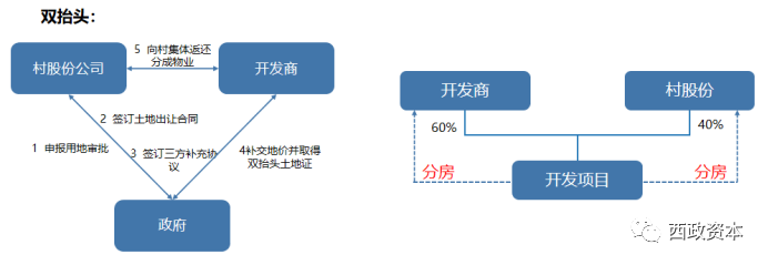需注意的是,单抬头的合作模式下,因项目公司分配给村股份公司的物业无法做税前扣除,因此在土地成本(如非农或征返用地的出让金)很低的情况下综合税负就会高很多,另外开发商完成项目的开发建设并在分配物业的过程中,因项目公司分配给村股份公司物业需按视同销售处理,因此在土地成本很低的情况下相当于开发商还要额外掏出现金去缴纳分配物业过程中的巨额税费,由此就催生了双抬头的合作模式。