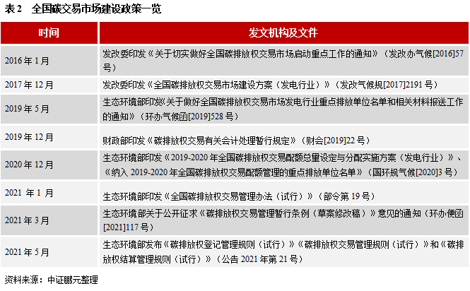 试点地区碳交易市场发展已有近8年,在促进试点省市企业温室气体减排方面取得了成效,同时为全国碳交易市场的建设提供了借鉴的基础,在制度、人才、系统等方面积累了经验。2017年12月,发改委印发《全国碳排放权交易市场建设方案(发电行业)》,正式启动全国碳排放交易体系,按照先易后难、稳中求进的安排,在发电行业(含热电联产)率先启动全国碳排放交易体系。2018年,应对气候变化与发展碳交易市场职责从发改委转到生态环境部。2021 年1月,生态环境部印发《全国碳排放权交易管理办法(试行)》,自2021 年2 月1 日起施行,正式启动全国碳市场第一个履约周期。2021年3月30日,生态环境部关于公开征求《碳排放权交易管理暂行条例(草案修改稿)》意见的通知。除了以上政策,还发布了多项配套政策制度、技术规范等。在全国碳排放权交易机构和注册登记机构成立前,由上海环境能源交易所和承担全国碳排放权交易系统账户开立和运行维护等具体工作,由湖北碳排放权交易中心承担全国碳排放权注册登记系统账户开立和运行维护等具体工作。