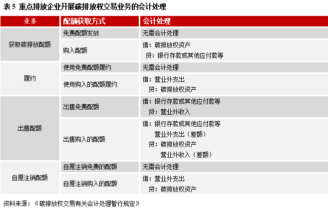 根据《碳排放权交易有关会计处理暂行规定》,重点排放企业在资产负债表中的“其他流动资产”项目下设“碳排放权资产”科目,其开展碳排放权交易业务的会计处理如表5所示。根据企业碳排放配额的获取方式不同,交易业务的会计处理也不同。我们继续以前文所述A企业和B企业为例进行说明。对A企业来说,其实际排放量小于免费配额发放量,所以无需购入配额来履约,如果最后A企业选择将结余的10吨免费配额转至下年度使用,则全程无需会计处理,如果最后A企业选择将结余的10吨免费配额出售,则仅需在出售配额时做“借:银行存款或其他应付款等 贷:营业外收入”会计处理,获取营业外收入。对B企业来说,其实际排放量大于免费配额发放量,需要购入配额来履约,对于免费配额的获取和履约无需会计处理,但是对于购入配额的获取和履约则分别需要做如下会计处理“借:碳排放权资产 贷:银行存款或其他应付款等”、“借:营业外支出 贷:碳排放权资产”。