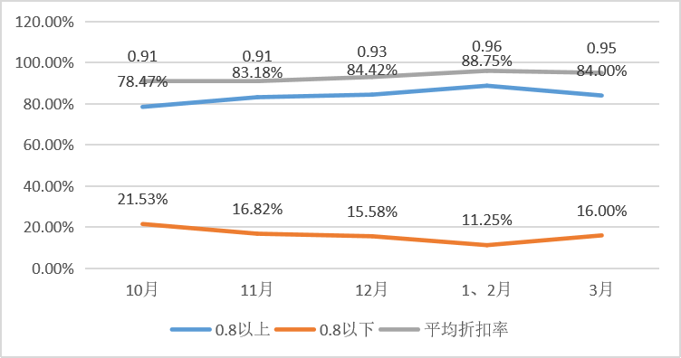 近半年成交市价比在0.8以下的占比最高的是10月,最低的是1、2月。平均折扣率最高的是在1、2月,为96折,3月平均折扣率依然很高与1、2月持平。