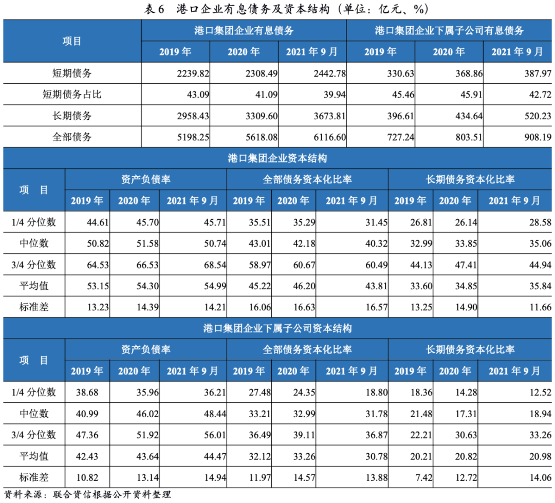 值得关注的是,港口集团企业负债水平分化较为明显,处于后1/4分位的港口集团企业负债水平明显偏高,其中6家企业2021年9月底的全部债务资本化比率超过60%。