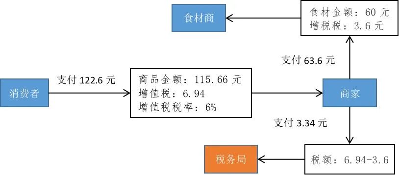 以日常生活中的餐饮为例,在消费结束后开具增值税发票,发票金额中经常会出现三个金额,如下图所示,作为消费者最终要支付的金额为122.6元。但通过发票可以看出,其组成结构为两部分:即115.66元+6.94元。115.6元是餐饮服务实际发生的金额;6.94元是伴随这项消费产生的增值税。