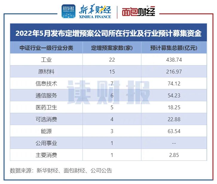 从行业分布来看,以中证行业统计,2022年5月,工业有22家公司发布定增预案,数量排在各行业之首;原材料行业排在第二位,有15家公司发布定增预案;信息技术行业有7家发布定增预案,位列第三位。