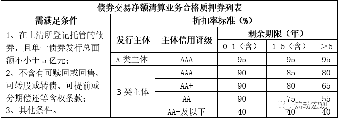 (1)2016年8月24日,上清所发布的《债券交易净额清算业务质押式回购质押券管理规程》明确上清所负责设定可纳入通用质押券业务的合资格债券标准,合资格债券折扣率根据主体信用水平、债券剩余期限、价格波动和市场流动性等设定。其中,质押券价值=债券总面额累计*全价估值*折扣率/百元剩余本金。