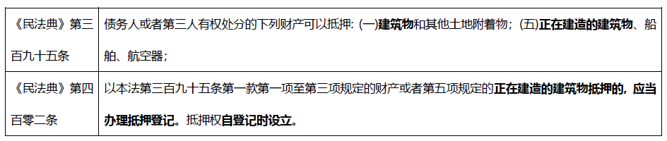 所谓在建工程, 顾名思义, 即为正在建造、尚未办理所有权首次登记的房屋等建筑物, 且通常情况下都是尚未经过竣工验收的房屋。根据《民法典》的相关规定, 无论是取得所有权证的房屋还是在建工程均可办理抵押, 且抵押权均自登记时设立。