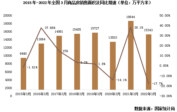 受2021年同期前值较高影响(2021年3月销售规模超1.8亿平方米,为近5年最高),2022年3月商品房销售同比降幅创2015年以来新低。但从绝对值来看,3月销售规模与2017年-2019年同期平均水平相当。