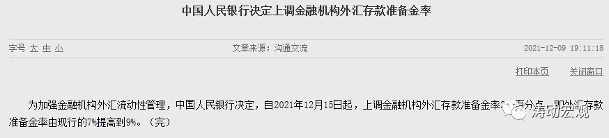 2021年12月9日,央行官网宣布“为加强金融机构外汇流动性管理……自2021年12月15日起,上调金融机构外汇存款准备金率2个百分点,即外汇存款准备金率由现行的7%提高到9%”。实际上,这已经是2021年以来第二次上调外汇存款准备金率。
