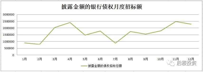 除1月外,银行月度出让次数曲线的区间为94-206次,区间中值为150次左右,户数区间为827-2776户,区间中值为1800户左右,而月度出让成交金额的区间中值则为350亿元左右。1月和7月是公告成交的高峰期,这与业务规律也契合。