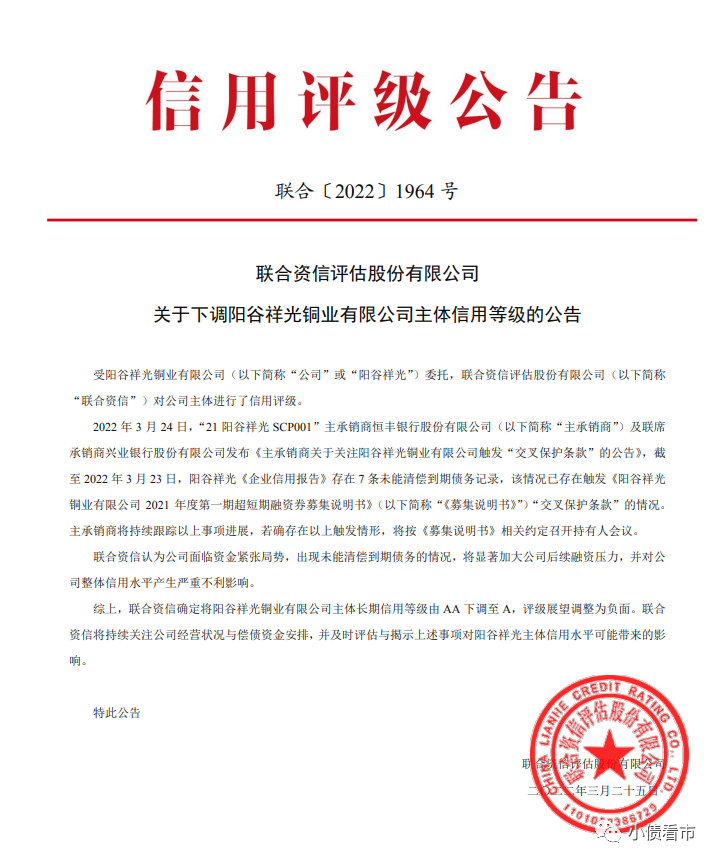 公告显示,截至2022年3月23日,阳谷祥光《企业信用报告》存在7条未能清偿到期债务记录,已触发《阳谷祥光铜业有限公司2021年度第一期超短期融资券募集说明书》“交叉保护条款”。