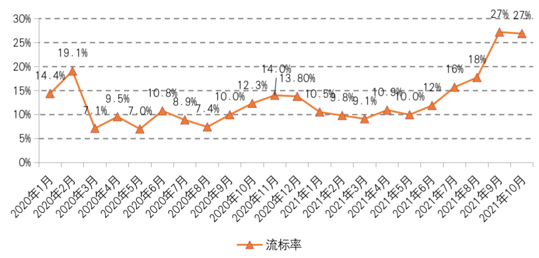 在此影响下,2021年10月成交溢价率较上月进一步走低,环比减少0.9个百分点,降至3.3%,再创下2020年以来的最低值。