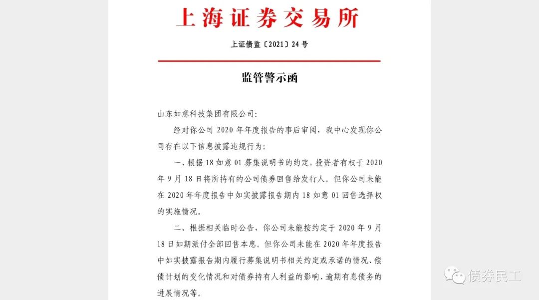 根据网站的公开信息,上海证券交易所于2021年5月16日向山东如意科技集团有限公司(以下简称“如意集团”)出具监管警示函,主要原因是未能披露18如意01的回售情况和未能在2020年度报告中如实披露应履行的信息披露义务。