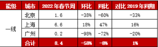 春节期间,一线城市的成交量同比微跌8%,主要源于去年基数较高,与2019年同期相比仍小幅微增1%。以上海为例,春节周成交量同环比齐增,较2019年增幅达到16%,市场热度较高。
