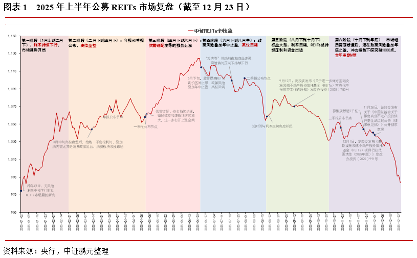 2025年我国公募REITs市场走势呈现倒V型,先涨后跌,指数年内最高涨幅达16%,临近12月底,累计跌幅回调至2%左右。截至12月23日,2025年中证REITs全收益指数报收983.81点,年内涨幅回调到1.65%,下半年市场的持续下跌拖累REITs在大类资产涨跌幅排名中表现靠后。从板块来看,消费基础设施REITs领涨市场,除了个别项目与年初持平,其余年内涨幅达18%-40%。市场持续扩容,全年共新发行REITs产品22只,其中首发20只,发行规模为407.81亿元,同时2单扩募项目,华夏北京保障房REIT扩募规模为9.46亿,国泰海通临港创新产业园REIT扩募规模为17.23亿。流动性方面,市场活跃度显著增强,2025年全市场日均成交额达5.9亿元,较2024年同期的4.21亿元大幅提升40%。2025年以来我国公募REITs二级市场走势可以分为六个阶段:
