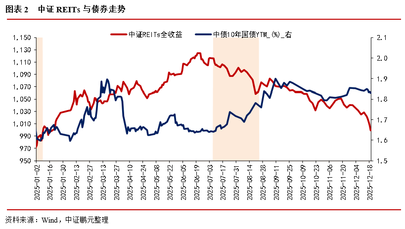 2025年我国公募REITs走势可以分为六个阶段:第一阶段是从一月初到二月末,市场强势开局,无风险利率中枢持续下行,REITs的高分红优势凸显。第二阶段是从二月末到四月末,REITs市场呈现高位盘整格局。第三阶段是从四月末到六月下旬,市场进入供需错配主导的强势上涨阶段。这一阶段的行情主要由资金驱动,与股债市场表现相关性差,形成独立分化走势,机构投资者普遍处于欠配状态,仓位回补需求与持续涌入的前期踏空资金共同推动市场上行。第四阶段是六月下旬到八月中旬,市场开启下半年下跌行情,呈现高位回调态势。监管窗口指导询价区间上下限提高,推高新发REITs的定价水平,对市场情绪形成压制,叠加估值偏高和止盈,市场普遍回调。第五阶段是八月下旬到十月下旬,市场经历短暂回调后进一步突破下行。这一阶段,REITs市场与债券相关性有所钝化,随着权益市场进入震荡阶段,市场风险偏好降温,REITs市场吸引部分资金回流,后续权益市场再度大涨,利率回调,REITs被持续压制和资金出逃,再次进入阴跌模式。第六阶段是十月下旬至十二月下旬,市场在盘整后进入持续下行通道,指数一度跌破1000点整数关口。12月之后,经营权本息拆分预期升温,叠加年底机构止盈需求,双重压力下市场进入快速下跌阶段,12月10日起,市场经历10连跌,指数一度跌破1000点。
