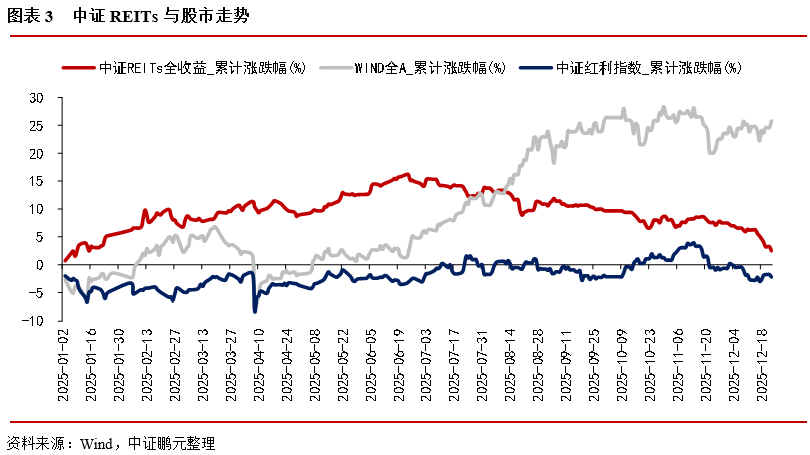 第四阶段是六月下旬到八月中旬,市场开启下半年下跌行情,呈现高位回调态势。6月下旬,监管部门通过窗口指导提高了REITs询价区间的上下限,直接推高了新发REITs的定价水平,对市场情绪形成明显压制。除政策风险外,年中节点机构止盈情绪升温,叠加股市持续走强吸引部分资金分流,进一步加剧市场调整压力。从大类资产定价逻辑来看,“反内卷”推动股市和商品走强,风险偏好压制下,REITs市场与股票市场走势的相关性显著增强。7月底是二季报集中披露节点,指数在短暂修复回调后,受自身估值偏高、上行空间不足等多因素影响,继续维持下行态势。截至8月19日,这一阶段REITs指数累计下行70.5点,跌幅达6.3%。