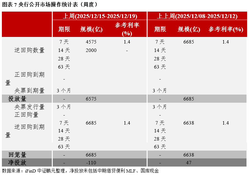 上周(2025/12/15-2025/12/19)流动性相对平稳,回购利率涨跌互现。具体来看,隔夜利率较前一周上行0.44BP至1.35%,7天回购利率上行0.73BP至1.51%。中等期限方面,14天回购利率上行6.91BP至1.62%,21天回购利率上行16.06BP至1.72%,1个月回购利率下行0.62BP至1.69%。