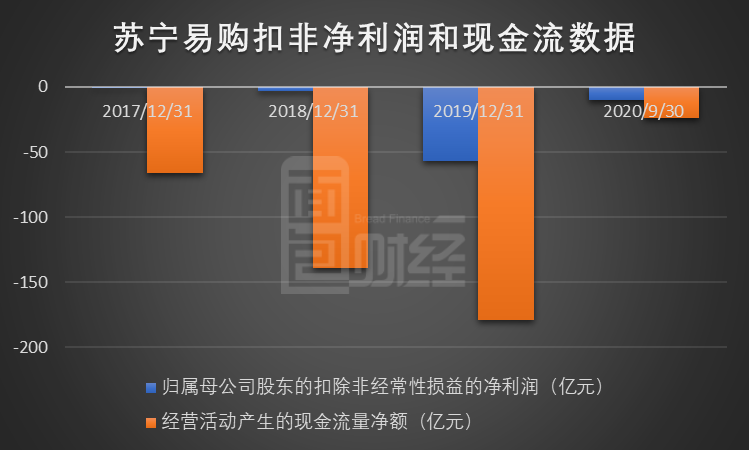 根据苏宁易购近三年披露的年报和2020年的三季度季报,公司经营活动产生的净现金流和同期的公司扣非净利润持续为负。