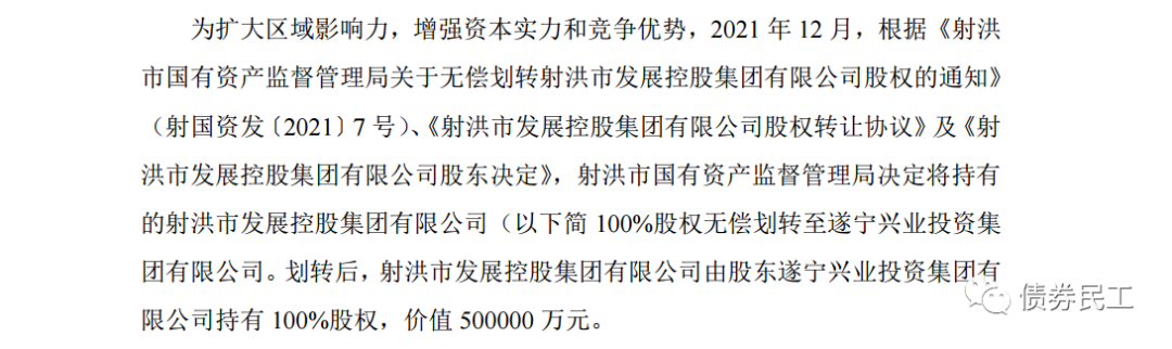 5、根据射洪市国有资产经营管理集团有限公司(主体信用等级AA-)2022年1月28日的公告,射洪市国有资产监督管理局决定将持有的射洪市发展控股集团有限公司100%股权无偿划转至遂宁兴业投资集团有限公司。遂宁兴业投资集团有限公司未发行过债券。