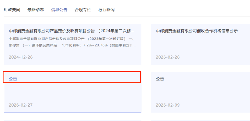 其中,中邮消金和海尔消金的披露内容均隐藏在标题仅为“公告”文件中,前者需逐一点开新页面查找,后者虽可在右侧直接显示,但仍增加了消费者获取信息的成本。