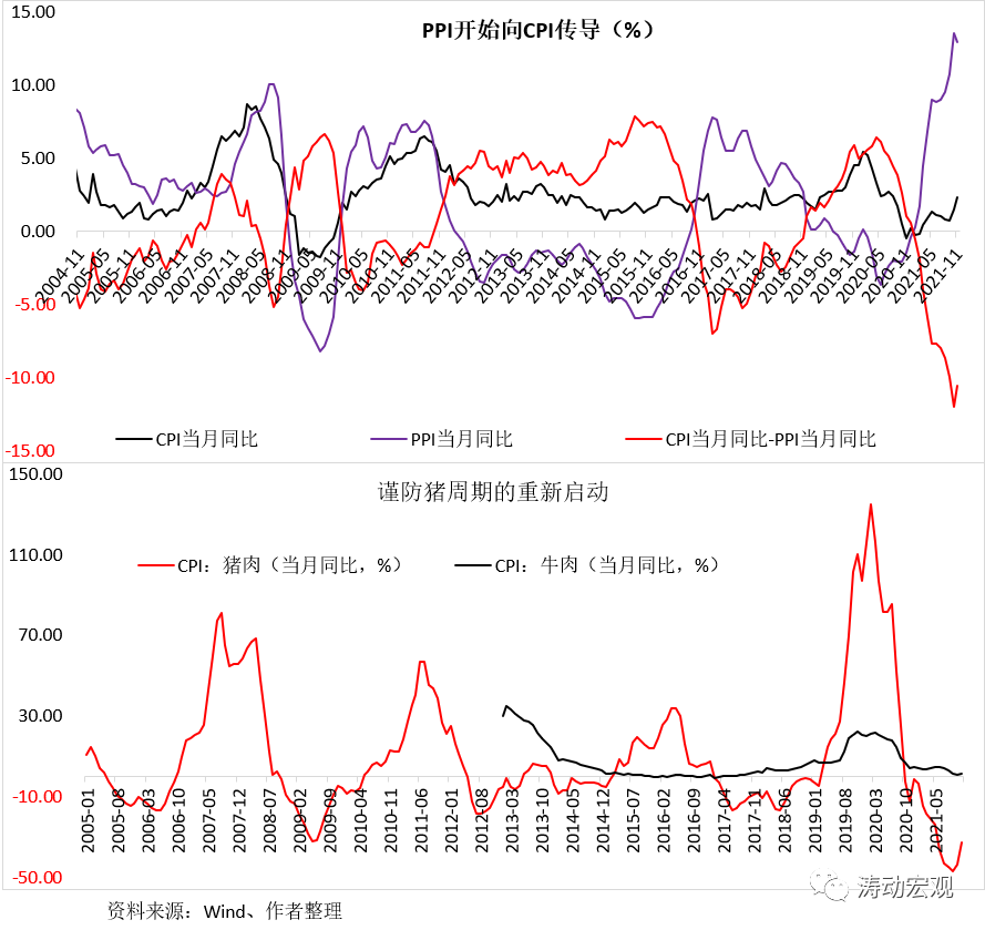 大宗商品价格上行导致生产成本处于高位是这一段时期以来的聚焦点,而11月数据显示PPI与CPI之间的剪刀差在继续扩大之后呈现出一定缓和的态势,而PPI已经开始向CPI传导。具体,今年11月当月,CPI同比已经连续两个月回升至2.30%,PPI同比则进一步回落至12.90%但仍处在高位水平,这表明不仅生产端的成本压力愈发突出,消费端的压力实际上也开始体现。特别是,2022年需要对猪周期的反转有一定心理准备。