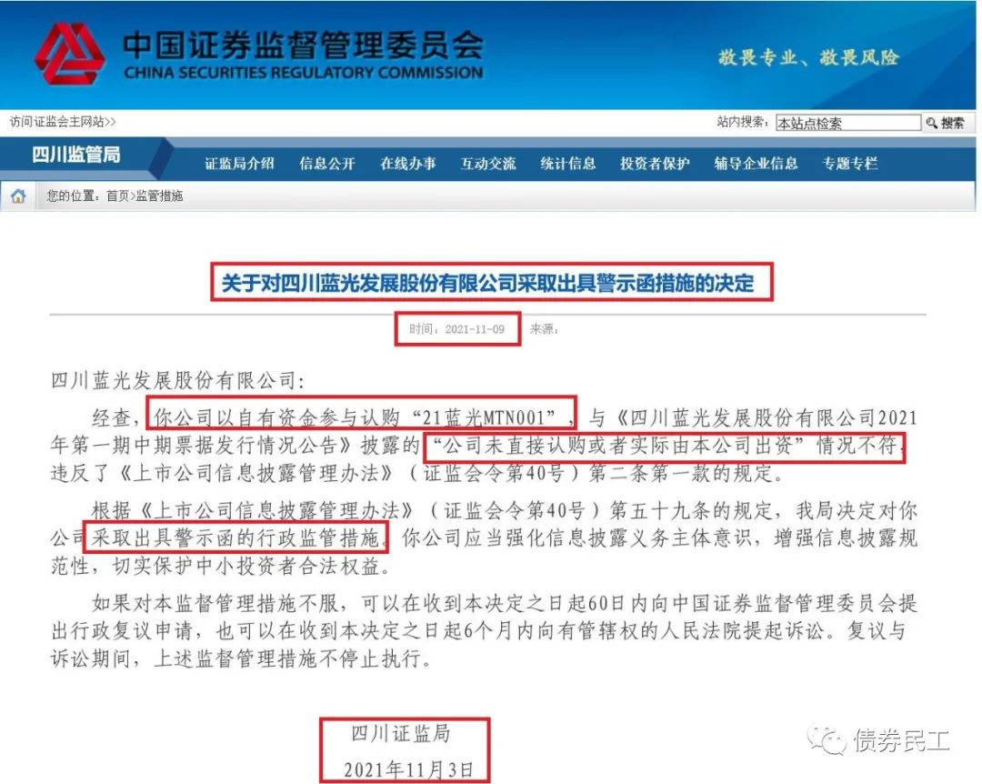 根据中国证监会四川监管局披露的信息,四川蓝光发展股份有限公司(以下简称“蓝光发展”)因以自有资金参与认购“21蓝光MTN001”,被采取出具警示函的行政监管措施。这份监管措施的落款日期是2021年11月3日,公开披露日期是2021年11月9日。