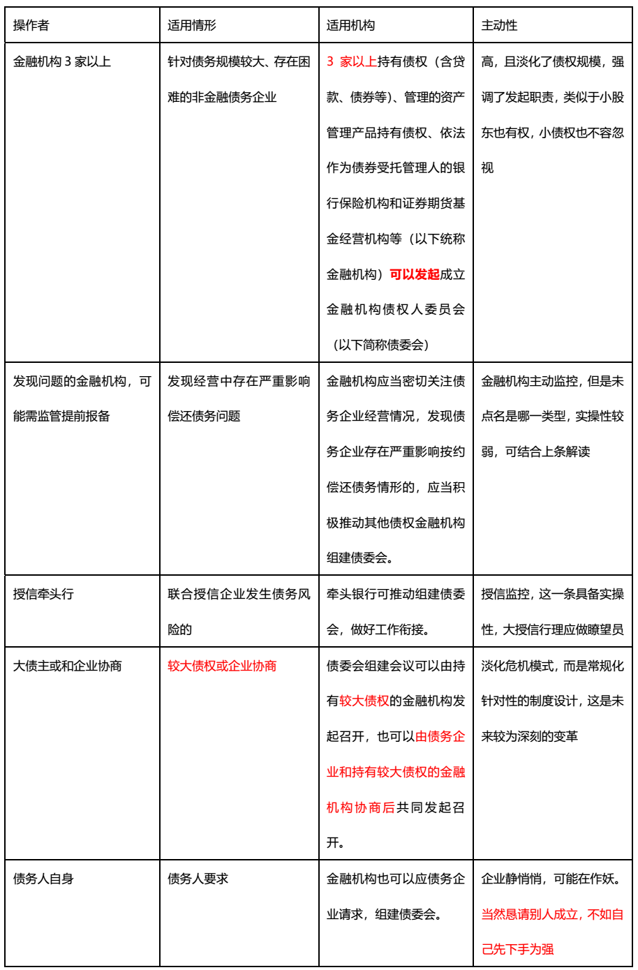 但是随着《中国银保监会 发展改革委中国人民银行 中国证监会关于印发金融机构债权人委员会工作规程的通知》的明确章程,我们清晰看到工作思路的转变,更多是提前组建,持续监督的思路。