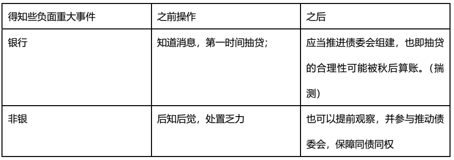 那么如果此后出现较为类似的情况,企业可先下手为强,不至于资金冻结、持续抽贷,则保障正常经营下,对非银或者其他小债权人,也是一种潜在保护,历史的教训也是财富。当然,这个债委会起不到较大作用的点在于,此前银行抽贷行为视为合法,在既成事实的框架下予以默认,其实效果有限,已经踩踏,企业正常经营难以恢复。