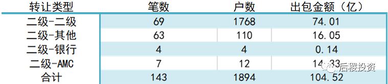 另上述所列二级投资机构中,出包机构中有六家具有国资背景,收包机构中多达12家有国资背景,同时有三家“海尔系”企业。虽未在上述图表中列明,但二级投资机构中,还看到了律师事务所作为主体多次参与了出包和收包,也表明了市场参与主体的逐渐多元化。