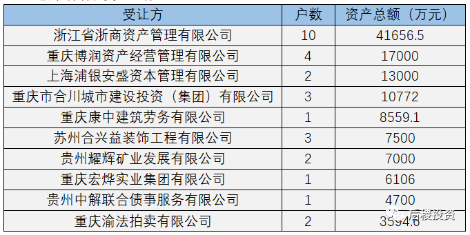 从上图看,渝康资管表现亮眼,受让金额遥遥领先,其余5家持牌AMC受让规模相差不大。