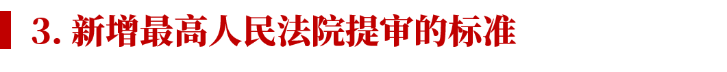 再审审查之后,最高人民法院决定提审的要求更高,需要满足:(1) 具有普遍法律适用指导意义的;(2) 最高人民法院或者不同高级人民法院之间近三年裁判生效的同类案件存在重大法律适用分歧,截至案件审理时仍未解决的;(3) 最高人民法院认为应当提审的其他情形。