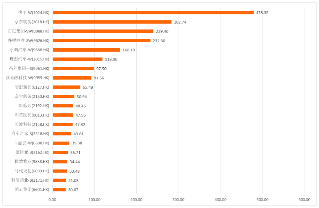超过百亿规模的共有6家企业,分别为快手(1024.HK)、京东物流(2618.HK)、百度集团、哔哩哔哩、小鹏汽车、理想汽车,其中快手以478.35亿港元的募资额高居榜首。而京东物流是国内最大的供应链物流巨头,也是继京东、达达集团、京东健康后,京东系的第四个IPO。小鹏和理想作为国内领先的智能汽车企业,赴港上市进一步弥补了港股市场的科技股的短缺。